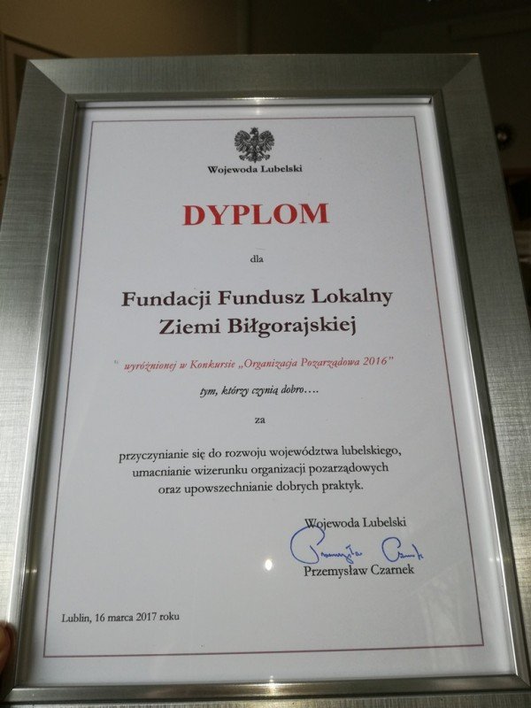 Wyróżnienie w konkursie wojewody lubelskiego „Organizacja pozarządowa 2016”.