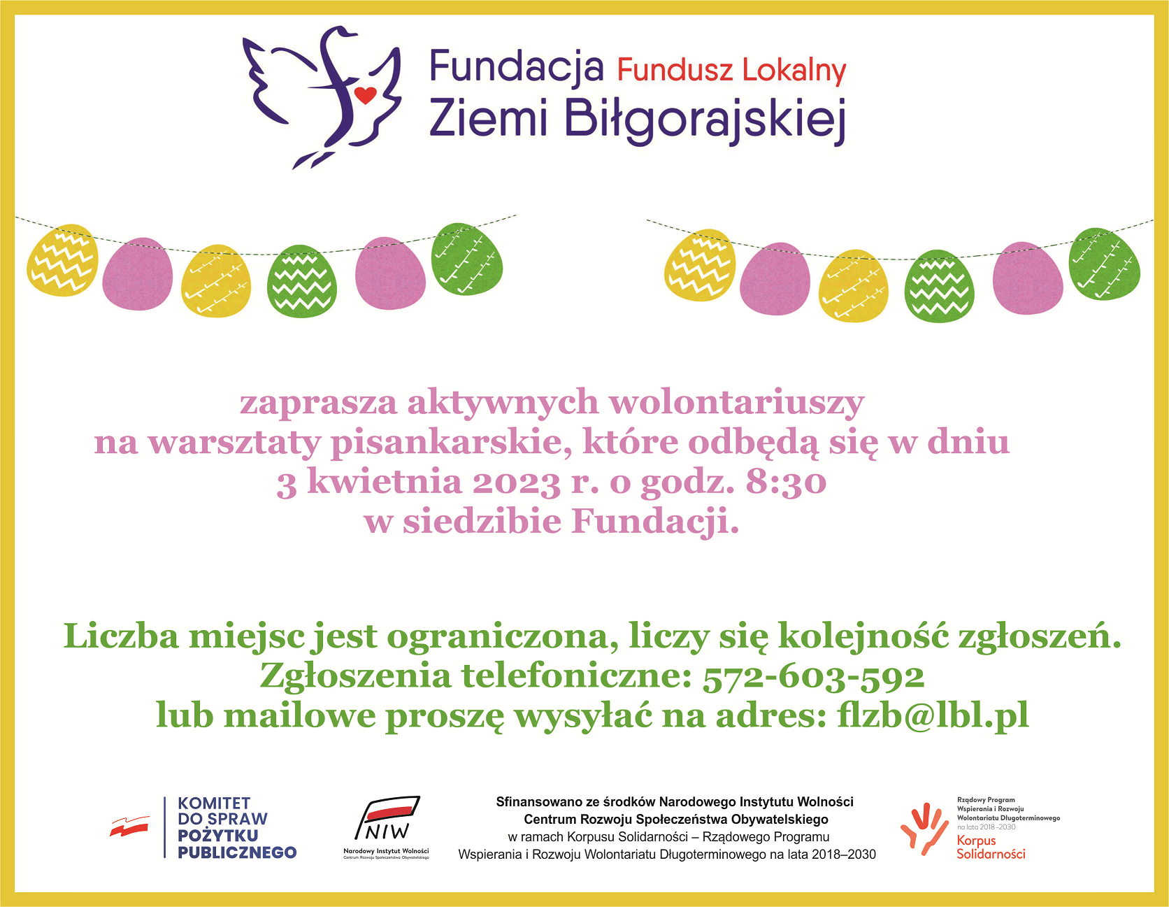 Warsztaty sfinansowano ze środków Narodowego Instytutu Wolnosci - Centrum Społeczeństwa Obywatelskiego w ramach Korpusu Solidarności - Rządowego Programu Wspierania i Rozwoju Wolontariatu Długoterminowego na lata 2018 2030.