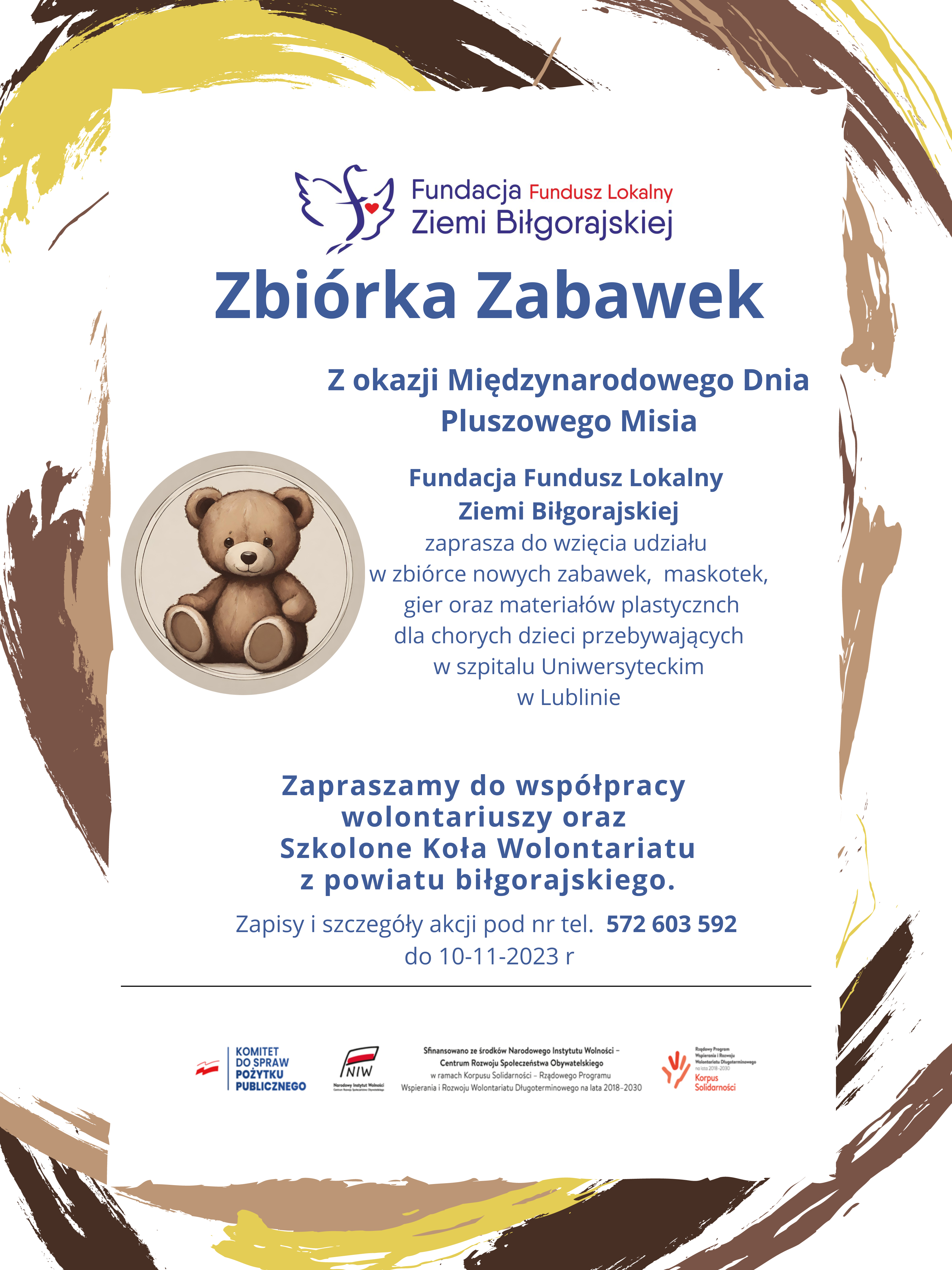 Z okazji Międzynarodowego Dnia Pluszowego Misia Fundacja Fundusz Lokalny Ziemi Biłgorajskiej zaprasza do wzięcia udziału w zbiórce nowych zabawek, maskotek, gier oraz materiałów plastycznych dla chorych dzieci przebywających w szpitalu Uniwersyteckim w Lublinie.