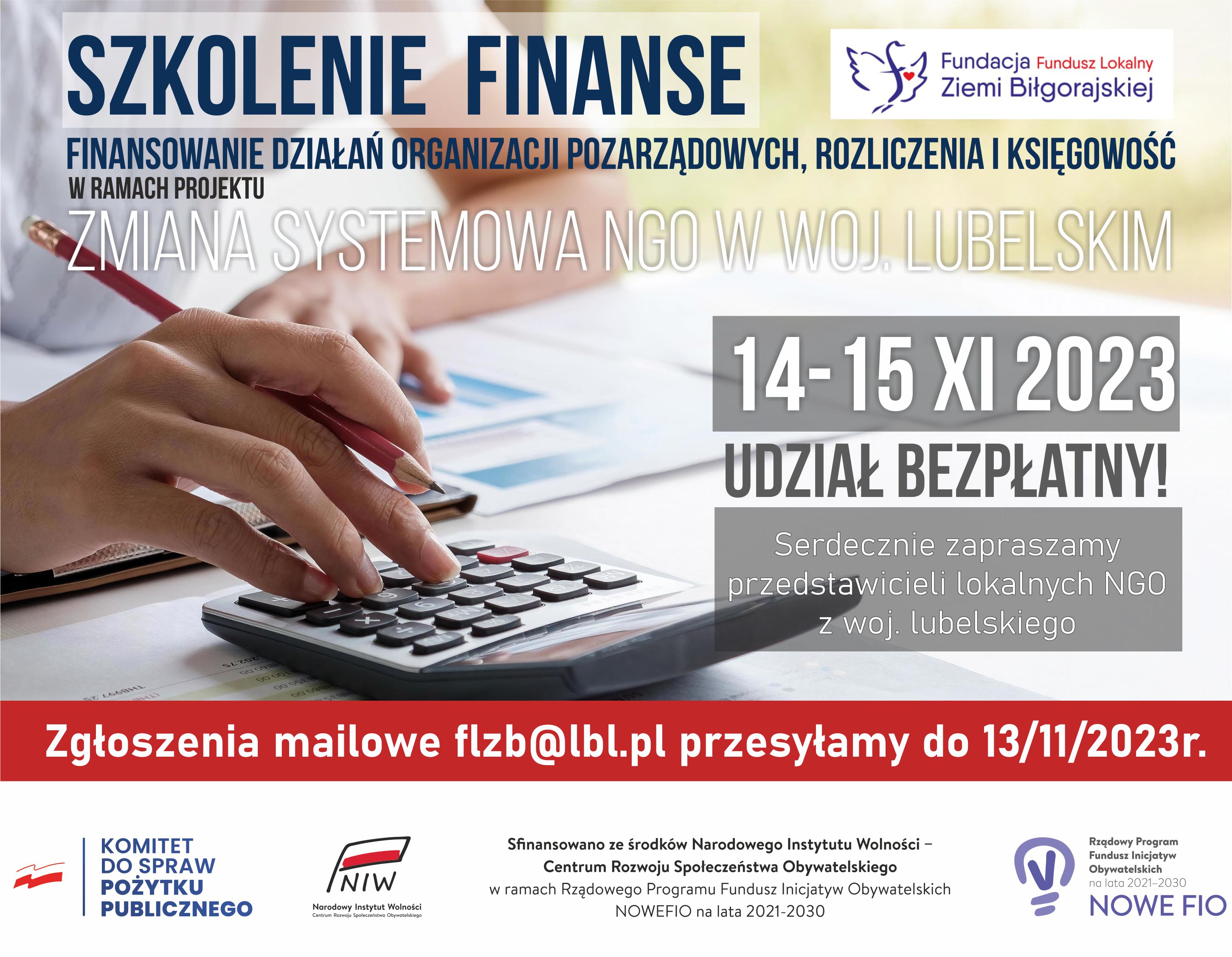 Serdecznie zapraszamy organizacje pozarządowe i grupy nieformalne (które mają na celu się sformalizować) z terenu woj. lubelskiego, do udziału w bezpłatnym szkoleniu pt. " Finansowanie działań organizacji pozarządowych, rozliczenia i księgowość " w ramach prowadzonego przez nas projektu "Zmiana systemowa NGO w woj. lubelskim"