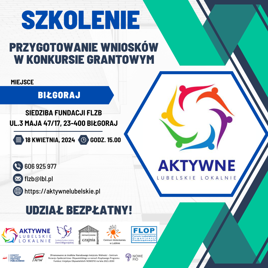 18 kwietnia o godzinie 15:00 odbędzie się szkolenie w Biłgoraju (siedziba Fundacji FLZB), z zakresu przygotowania wniosku w konkursie - serdecznie zapraszamy!