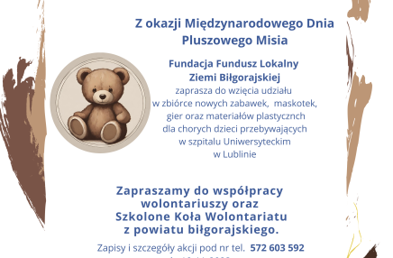 2023-11-08 Zbiórka zabawek dla chorych dzieci przebywających w szpitalu Z okazji Międzynarodowego Dnia Pluszowego Misia Fundacja Fundusz Lokalny Ziemi Biłgorajskiej zaprasza do wzięcia udziału w zbiórce nowych zabawek, maskotek, gier oraz materiałów plastycznych dla chorych dzieci przebywających w szpitalu Uniwersyteckim w Lublinie. Zapraszamy do współpracy wolontariuszy oraz Szkolne Koła Wolontariatu z powiatu biłgorajskiego i gminy Zwierzyniec! czytaj dalej »