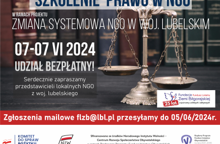 2024-05-27 Szkolenie Prawo w ngo 7-8 czerwca 2024r. Serdecznie zapraszamy organizacje pozarządowe i grupy nieformalne (które mają na celu się sformalizować) z terenu woj. lubelskiego, do udziału w bezpłatnym szkoleniu pt. " Prawo w ngo " w ramach prowadzonego przez nas projektu "Zmiana systemowa NGO w woj. lubelskim" Szkolenie rozpoczynamy 7 czerwca 2024r. o godzinie 9:00. Drugi dzień jest dniem warsztatowym z parktycznym wykorzystaniem nabytych umiejętności. Zapewniamy materiały szkoleniowe i wyżywienie. czytaj dalej »
