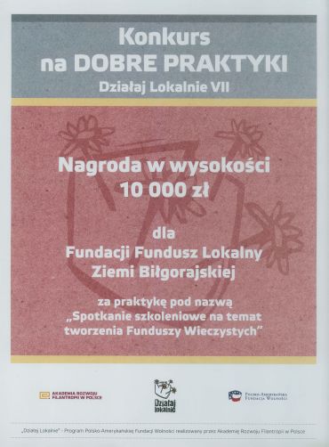 Fundacja Fundusz Lokalny Ziemi Biłgorajskiej w dniu 28 stycznia 2013 r. w Galerii Freta w Warszawie na uroczystym podsumowaniu siódmej edycji Programu Działaj Lokalnie otrzymała nagrodę w Konkursie na Dobre Praktyki, za praktykę pod nazwą "Spotkanie szkoleniowe na temat tworzenia Funduszy Wieczystych" w wysokości 10.000 zł. Nagrodę odebrał w imieniu Fundacji FLZB Pan Maciej Mulawa z rąk Pana Pawła Łukasiaka - prezesa Akademii Rozwoju Filantropii w Polsce.