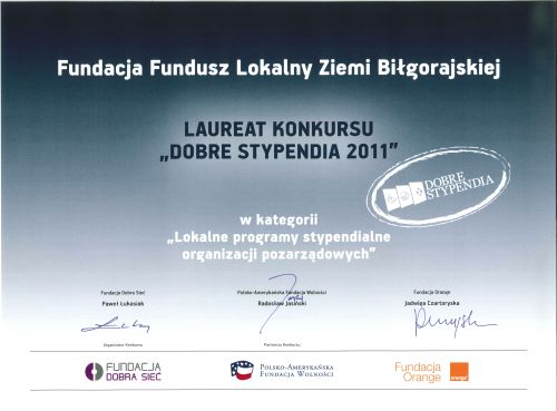 Fundacja Fundusz Lokalny Ziemi Biłgorajskiej została laureatem w kategorii „Lokalne programy stypendialne organizacji pozarządowych" i otrzymała tytuł „Dobre Stypendium 2011". Za stworzenie stabilnego finansowo, wieloletniego, angażującego całą lokalną społeczność programu stypendialnego, który nie tylko niesie pomoc finansową stypendystom, ale także integruje ich w Klubie Stypendysty oraz zachęca do podejmowania działań na rzecz dobra wspólnego. Kapituła konursu była jednomyślna i przyznała tylko jedną nagrodę w tej kategori.