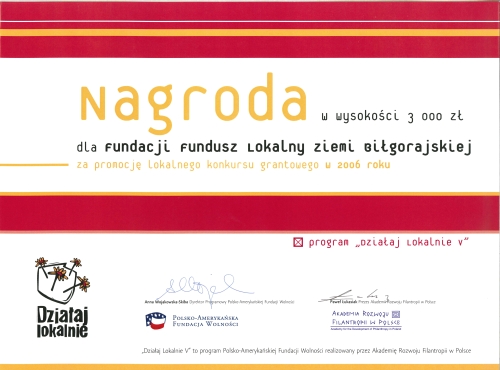 Fundacja Fundusz Lokalny Ziemi Biłgorajskiej otrzymała nagrodę dla najefektywniejszej LOG w roku 2006 w kategorii "nagłośnienie konkursu i promocja" w wysokości 3.000 zł.