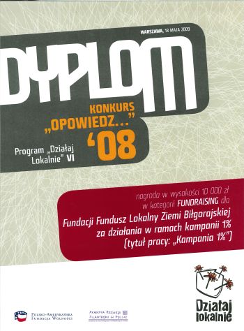 W dniu 28 maja 2007 r. koordynator Fundacji Pani Monika Pyda odebrała nagrodę z rąk Pani Anny Wojakowskiej-Skiby - dyrektora programowego Polsko-Amerykańskiej Fundacji Wolności i Pana Pawła Łukasiaka - prezesa Akademii Rozwoju Filantropii w Polsce.