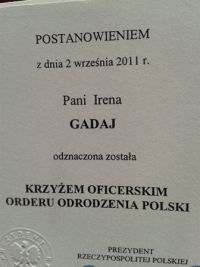 Prezydent RP Bronisław Komorowski wręczył 15 września 2011 r. w Pałacu Prezydenckim ordery za wybitne zasługi w działalności na rzecz budowania społeczeństwa obywatelskiego, za osiągnięcia w podejmowanej z pożytkiem dla kraju pracy zawodowej i społecznej. W sumie prezydent wręczył 44 odznaczenia. Miło nam poinformować że Pani Prezes Fundacji FLZB Irena Gadaj otrzymała Krzyż Oficerski Orderu Odrodzenia Polski.